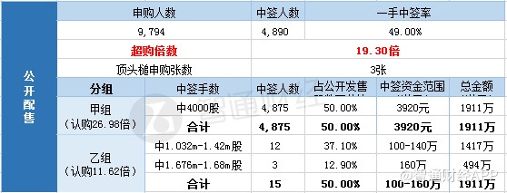 其中,公开配售申购人数9794,一手中签率49%,超购倍数19.3倍。