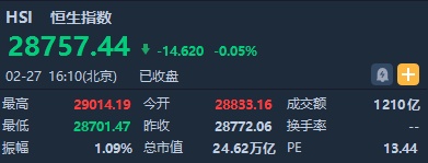 智通财经APP获悉,恒指早盘高开0.21%,随后震荡走高,午后走弱,并迅速翻绿。截至收盘,恒生指数跌14.62点或0.05%,报28757.44点,全日成交额达1210.43亿。国企指数跌0.75%,报11457.27点,红筹指数跌0.63%,报4501.57点。