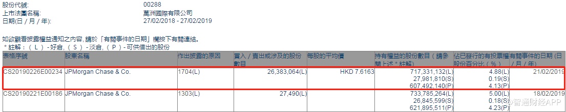 智通财经APP获悉,根据联交所资料显示,摩根大通于2月21日减持万洲国际(00288)2638万股,每股作价7.6163港元,总值约2.01亿港元,最新持股数目7.17亿股,最新持股比例减至4.88%。
