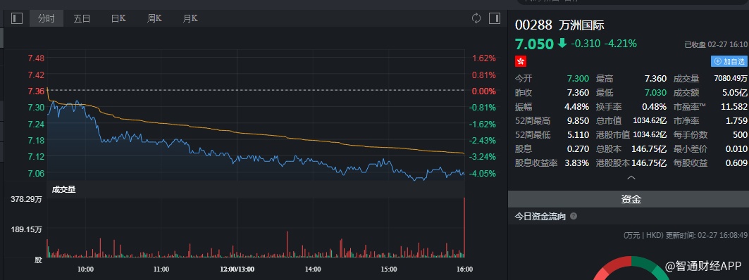 截至今日收盘,万洲国际(00288)跌4.21%,报7.05港元。