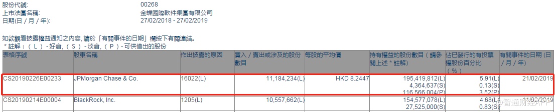 智通财经APP获悉,根据联交所资料显示,摩根大通于2月21日减持金蝶国际(00268)1118万股,每股作价8.2447港元,总值约9217.57万港元,最新持股数目1.95亿股,最新持股比例减至5.91%。