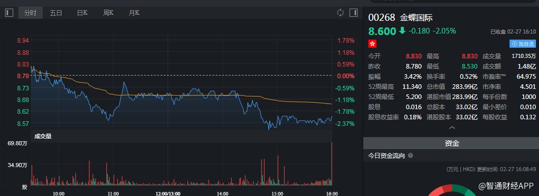 截至今日收盘,金蝶国际(00268)跌2.05%,报8.60港元。