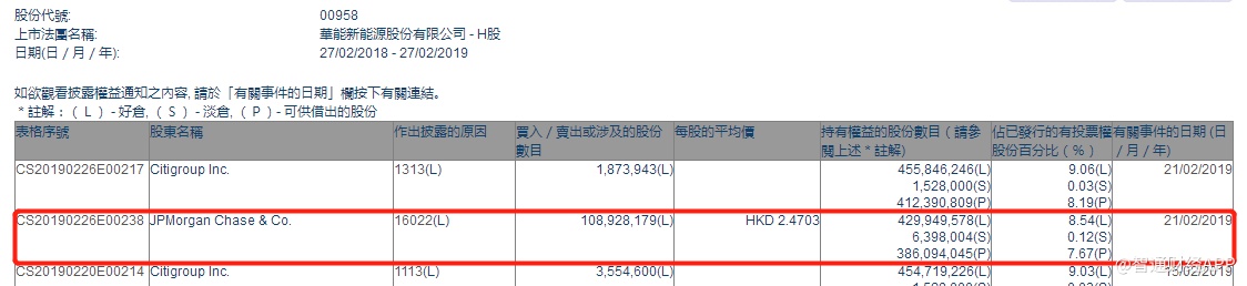 智通财经APP获悉,根据联交所资料显示,摩根大通于2月21日减持华能新能源(00958)1.08亿股,每股作价2.47港元,总值约2.67亿港元,最新持股数目约4.29亿股,最新持股比例减至8.54%。