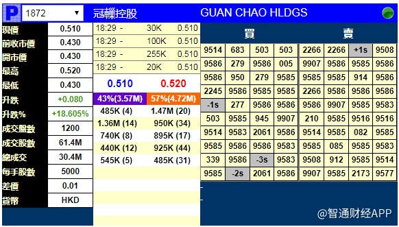 智通财经APP获悉,冠轈控股(01872)将于2月28日在香港挂牌,上市前夕,据辉立交易场资料显示,暗盘收报0.51港元,较招股价0.43港元,涨18.605%。每手5000股,不计手续费,每手赚400港元。