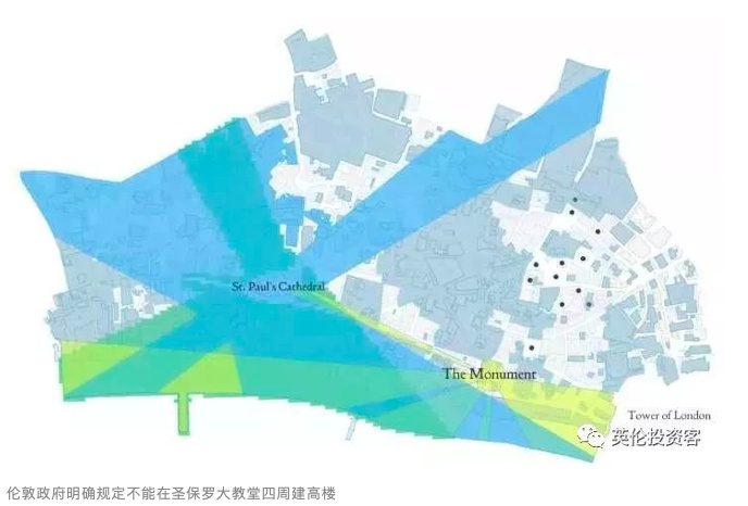 根据英国城市规划的法律规定,特定历史建筑物的景观和城市的天际线(Skyline)必须得到保护,因此伦敦市中心建筑物的高度受到极大限制。