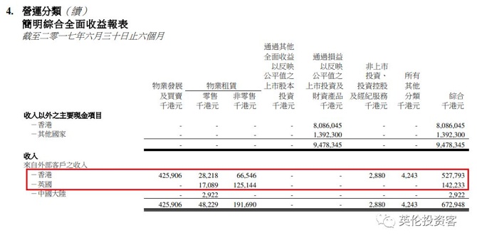 华人置业2017上半年财报显示,来自英国的租金收入达到1709万港元,非租金收到达到1.25亿港元,华人置业从英国赚走1.42亿港元。对比之下,华人置业从香港赚得5.27亿港元。