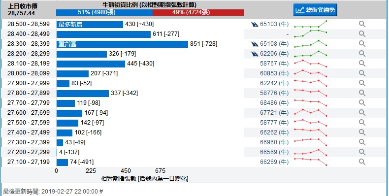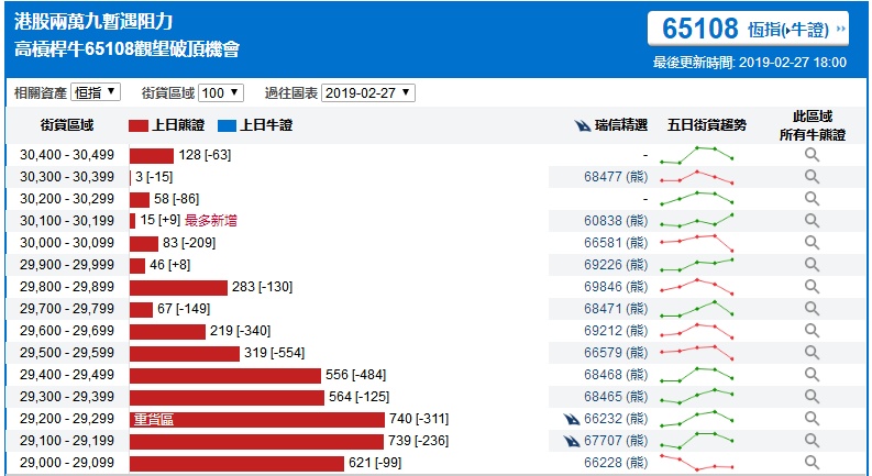智通财经APP获悉,截至2月27日,恒指最新的牛熊街货比例51:49。从瑞信恒指牛熊证街货分布图中得到的数据显示,熊证街货重货区在29200-29299区间,该区间最新熊证数量为740张,较上一交易日减少311张;最多新增区间在30100-30199。牛证街货重货区在28300-28399区间,该区间最新牛证数量为851张,比上一交易日减少728张;最多新增在28500-28599区间。