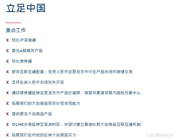 香港交易所集团的新愿景是成为国际领先的亚洲时区交易所,连接中国与世界。香港交易所表示,未来希望可以进一步增加对中国和亚洲市场的国际影响力,同时提升香港交易所作为亚洲市场对于国际市场的重要性,成为投资者和发行人在亚洲时区的首选市场。