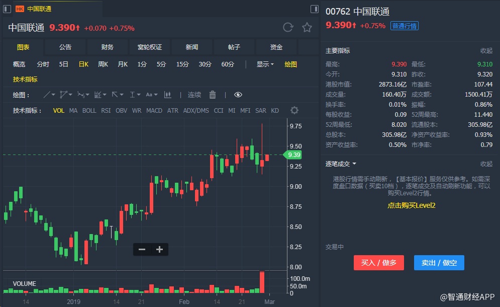 截至发稿,中国联通(00762)升0.75%,报9.390港元。