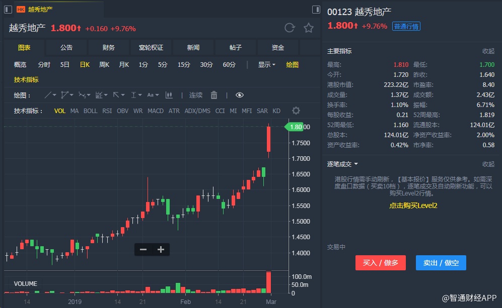 截至发稿,越秀地产(00123)升9.76%,报1.800港元。