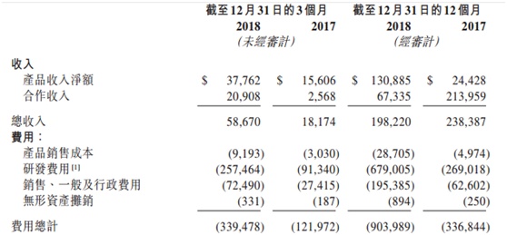 相反,全年录得收入成倍下降,而也源于新基。如2017年与后者签订的替雷利珠单抗合作协议生效后获得了转让授权的预付款。全年合作收入仅为6734万美元。简单来说,拿别人产品销售肯定要付本金的,明显走的是代理模式,尽管价值不菲,但此举避免了无产品、无收入的尴尬。