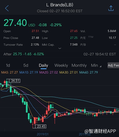 分析师预计GAAP和调整后每股收益2.08美元,销售额48.9亿美元。可比店铺销售额上升3%,预期上升约2.7%。L Brands预计2019全年每股收益在2.20-2.60美元之间,其中一季度盈利合每股盈亏持平。美东时间周三L Brands Inc股价收跌0.3%。