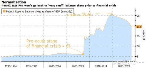 美联储的债券投资组合在金融危机前只约占美国GDP的6%,但根据鲍威尔周三公布的新数据显示,在开启QE政策“买买买”之后,目前已经达到GDP的19.5%。鲍威尔表示,资产负债表最终可能会达到GDP的16%或17%左右,也就是说,大概再减少3个百分点就将结束缩表了。