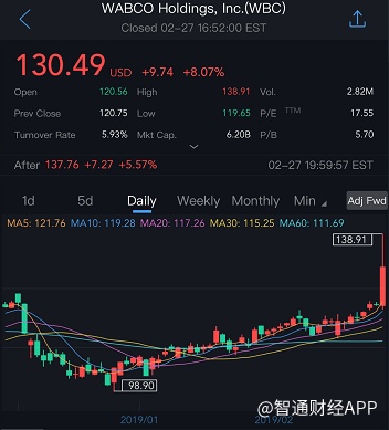 该消息一出,威伯科当日股价上涨8%,收盘价为130.49美元。目前,威伯科的市值约在62亿美元左右。