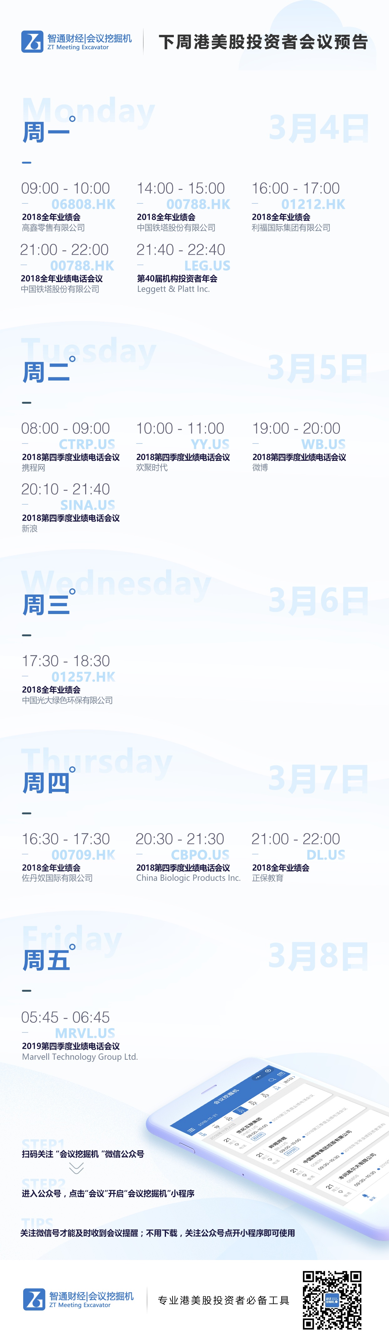 以下是智通财经“会议挖掘机”为您整理的下周(3月4日-3月8日 )港美股上市公司会议日历。
