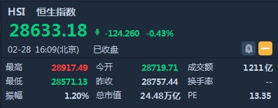 智通财经APP获悉,恒指早盘低开0.13%,报28719.71点。截至收盘,恒生指数跌124.26点或0.43%,报28633.18点,全日成交额达1211.91亿。国企指数跌0.78%,报11367.45点,红筹指数跌0.98%,报4457.6点。