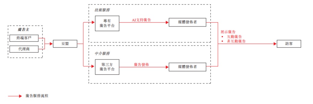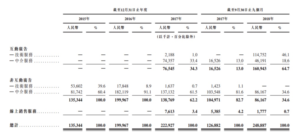 自成立以来,该公司一直透过专有广告平台提供作为技术服务及作为中介服务的广告服务,两者互为补充。一般而言,相比中介服务,该公司倾向提供技术服务,因其毛利率较高。截至2018年9月30日止九个月,中介服务的收益占其收益总额53.2%,技术服务收益占46.1%。