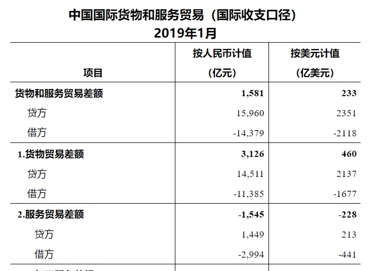 按美元计值,2019年1月,我国国际收支口径的国际货物和服务贸易收入2351亿美元,支出2118亿美元,顺差233亿美元。其中,货物贸易收入2137亿美元,支出1677亿美元,顺差460亿美元;服务贸易收入213亿美元,支出441亿美元,逆差228亿美元。