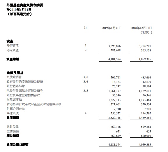 智通财经APP获悉,2月28日,香港金融管理局(金管局)公布,外汇基金资产负债表摘要及货币发行局帐目,数据显示,截至2019年1月31日,香港外汇基金总资产达4.18万亿港元,较2018年12月底增加1222亿港元,环比增长3%。其中外币资产增加1396亿港元,港元资产则减少174亿港元。