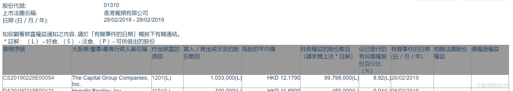 智通财经APP获悉,根据联交所资料显示,The Capital Group于2月26日减持香港宽频(01310)103万股,每股作价12.17港元,总值约1253.51万港元,最新持股数目约9979万股,最新持股比例减至9.92%。