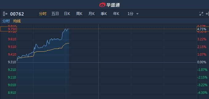 智通财经APP获悉,中国联通(00762)与华为联合展示SCC方案应用成果,H股放量上涨,截至11时05分,涨4.73%,报价9.75港元,成交额3.226亿。
