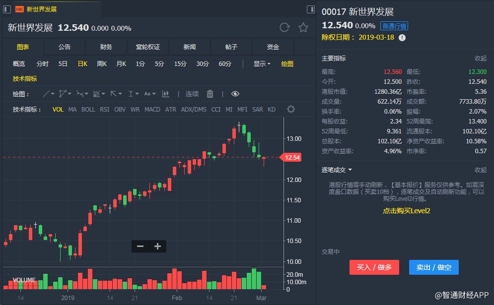 截至发稿,新世界发展(00017)无升跌,报12.540港元。