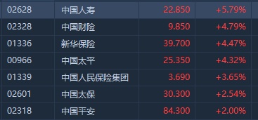 智通财经APP获悉,A股保险板块午后攻势再起,中国人保强势封板,中国人寿大涨超9%,港股內险股亦跟随大涨,截至发稿,中国人寿(02628)涨5.79%,中国财险(02328)、新华保险(02328)、中国太平(00966)涨超4%,中国人保(01399)涨3.65%。