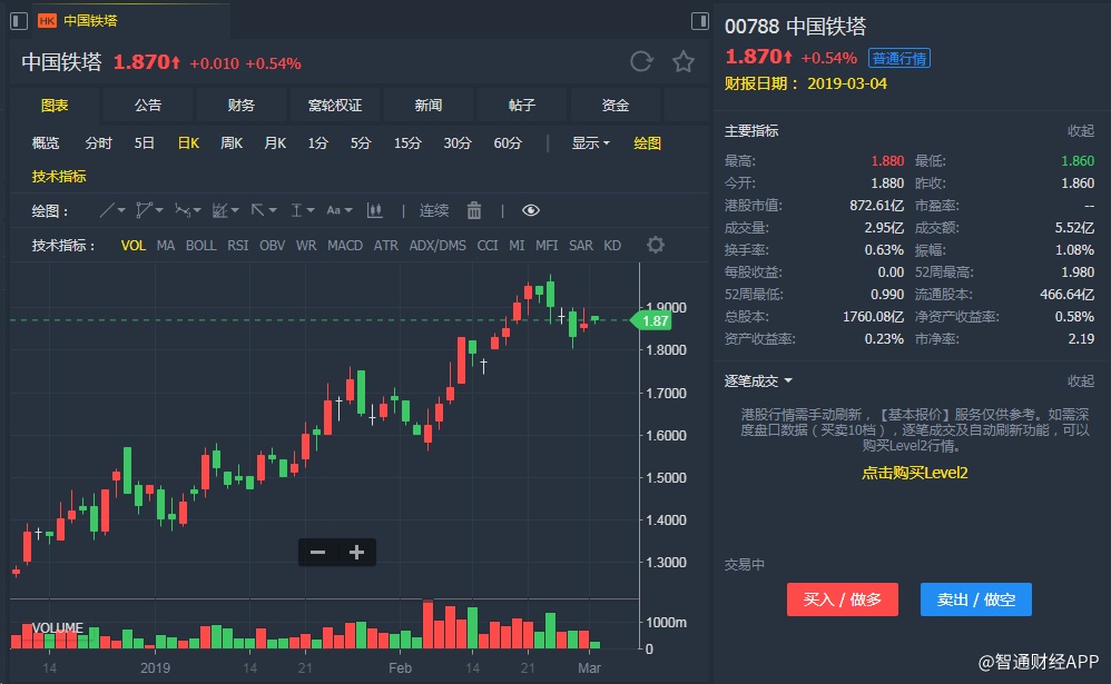 截至发稿,中国铁塔(00788)跌1.66%,报1.780港元。
