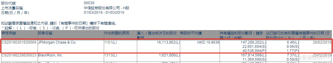 智通财经APP获悉,根据联交所资料显示,摩根大通于2月26日增持中信证券(06030)1611万股,每股作价19.8636港元,总值约3.20亿港元,最新持股数增至1.47亿股,最新持股比例增至6.46%。