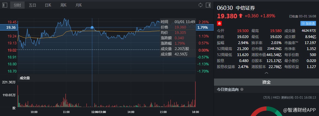 截至今日收盘,中信证券(06030)升1.89%,报19.38港元。