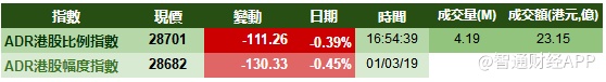 智通财经APP获悉,隔夜美股反弹,但港股ADR指数表现疲弱,按比例计算,收报28701点,跌111点。大型蓝筹全线回软,汇丰控股收报63.75元,较港收市跌0.45元;腾讯控股收报334.68元,较港收市跌1.52元。