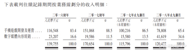 1、 手机游戏开发及营运:开发及营运手机游戏,重点为休闲手机平台游戏,主要的收益来自手机游戏中的虚拟物品的销售;2016财年、2017财年及2018年前9月的收入占总收入比分别为83.4%、88.5%及65.4%。