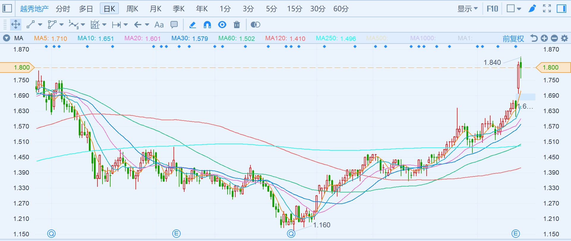 近几日,港股内房股时不时有个股开始躁动,如2月28日,受“业绩靓丽+广州地铁入股”双重利好,越秀地产(00123)当日放量跳空上涨10.37%,明显异动。