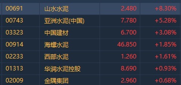 智通财经APP获悉,水泥股早盘快速拉升,截至发稿,山水水泥(00691)涨8.3%,亚洲水泥(00743)涨5.28%,中国建材(03323)涨3.08%,海螺水泥(00914)涨1.85%。