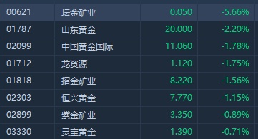 智通财经APP获悉,黄金股早盘你是走低,截至发稿,坛金矿业(00621)跌5.66%,山东黄金(01787)跌2.2%,招金矿业(01818)跌1.56%,紫金矿业(02899)跌0.89%。