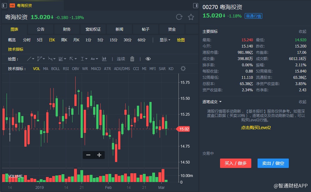 截至发稿,粤海投资(00270)跌1.18%,报15.020港元。