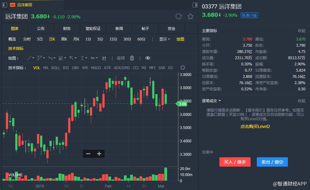 截至发稿,远洋集团(03377)跌2.90%,报3.680港元。