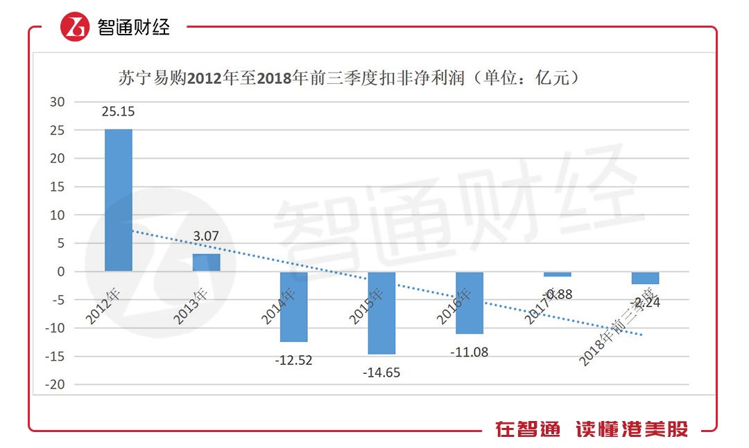 利润方面,2012年苏宁实现25.15亿元的扣非净利润后开始大幅下降,2015年扣非亏损达到14.65亿元。