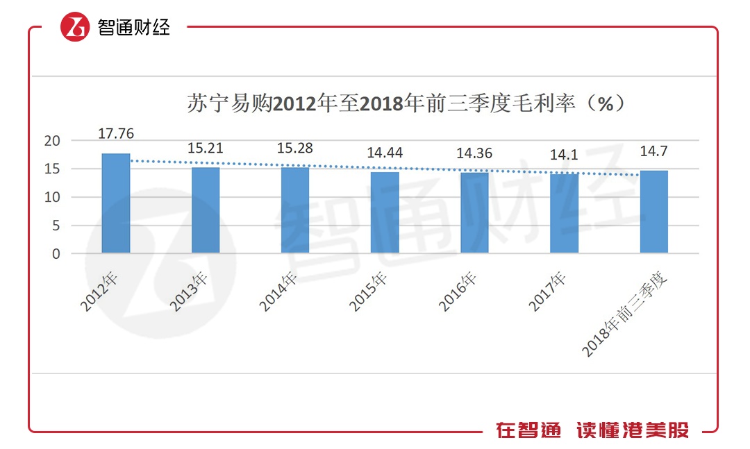 自2012年开始,苏宁的毛利率呈下滑趋势,从17.76%一路下跌至2017年的14.1%。