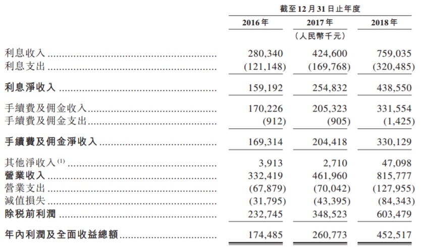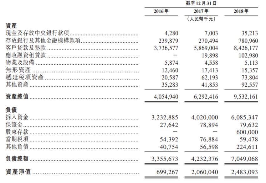 于往绩记录期间,截至2016年、2017年及2018年12月31日,该公司的资产净值分别为人民币669.3百万元、21亿元及25亿元,主要由于其资产负债表中拥有作资产的客户贷款及垫款结余有所增加,其部分被记录为负债的拆入资金所抵消。