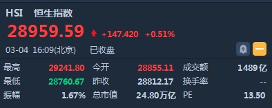 智通财经APP获悉,恒指早盘高开0.15%,报28855.11点。盘中曾一度站上两万九大关,截至收盘,恒生指数涨147.42点或0.51%,报28959.59点,全日成交额达1489.19亿。国企指数涨0.6%,报11575.53点,红筹指数涨0.49%,报4561.33点。