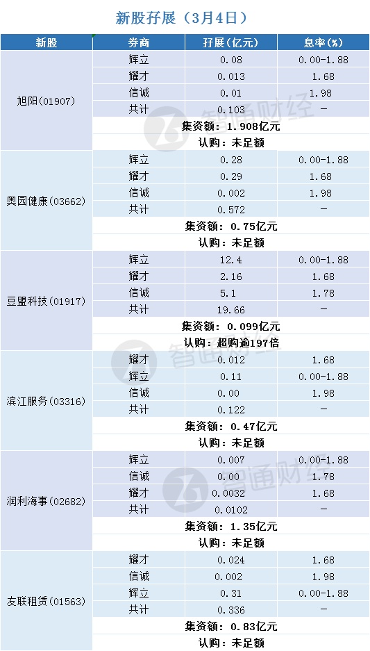 智通财经APP获悉,旭阳(01907)、奥园健康(03662)、豆盟科技(01917)、友联租赁(01563)、滨江服务(03316)和润利海事(02682)正在招股中,截至3月4日,友联租赁(01563)、滨江服务(03316)和润利海事(02682)孖展未足额,豆盟科技(01917)超购逾197倍。