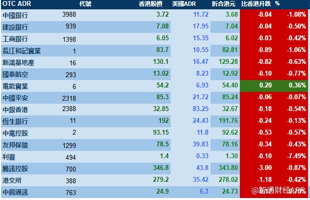 智通财经APP获悉,隔夜美股集体下挫,港股ADR指数表现疲弱,按比例计算,收报28815点,跌143.82点。大型蓝筹几乎全线回软,汇丰控股收报63.86元,较港收市跌0.34元;腾讯控股收报343.8元,较港收市跌3元。