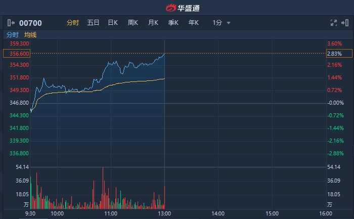 智通财经APP获悉,腾讯(00700)早盘稳步走升,午间收于最高点,贡献指数达81点,截至12时整,涨2.83%,报356.6港元,成交额达55.76亿港元。