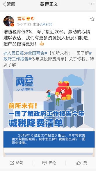小米集团CEO雷军表示:“今天上午听了总理的政府工作报告,现场气氛热烈,大家非常兴奋,特别提气。我粗略统计,鼓掌43次。这次报告信息量大,讲实干、接地气、聚民心、鼓干劲。最直观的是增值税大幅下降让企业轻装上阵。增值税降低3%,下降幅度接近20%,这对制造业企业有巨大好处。我们深刻感受到了政府减税降费的力度。 制造业、交通运输业、建筑业等主要行业税负明显降低,作为企业家和投资人,我预测企业创新的热情将会被大大激发。”