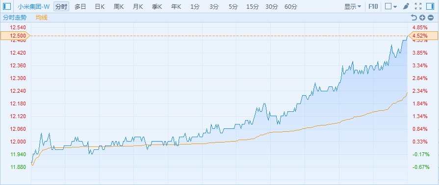 据智通财经APP获悉,受惠于政府工作报告的减税大礼包刺激,属于智能制造行业又根深互联网领域的小米集团-W(01810)一路走高,截至16时,涨4.52%,报价12.5港元,成交额为16.61亿港元。