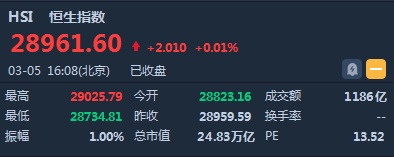 智通财经APP获悉,恒指早盘低开0.47%,报28823.16点。截至收盘,恒生指数涨2.01点或0.01%,报28961.6点,全日成交额达1186.58亿。国企指数涨0.06%,报11582.61点,红筹指数跌0.34%,报4545.87点。