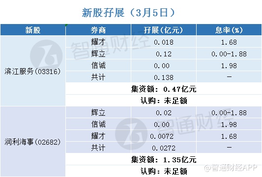 智通财经APP获悉,滨江服务(03316)和润利海事(02682)正在招股中,截至3月5日,滨江服务(03316)和润利海事(02682)孖展未足额。