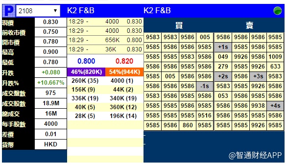 智通财经APP获悉,K2 F&B HOLDINGS LIMITED(02108)将于3月6日挂牌,上市前夕,据辉立交易场资料显示,暗盘收报0.83港元,较招股价0.75港元,升10.667%。每手4000股,不计手续费,每手赚320港元。