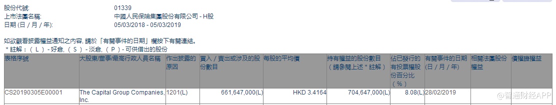 智通财经APP获悉,根据联交所资料显示,The Capital Group于2月28日增持中国人民保险(01339)6.61亿股,每股作价3.41港元,总值约22.54亿港元,最新持股数增至7亿股,最新持股比例增至8.08%。